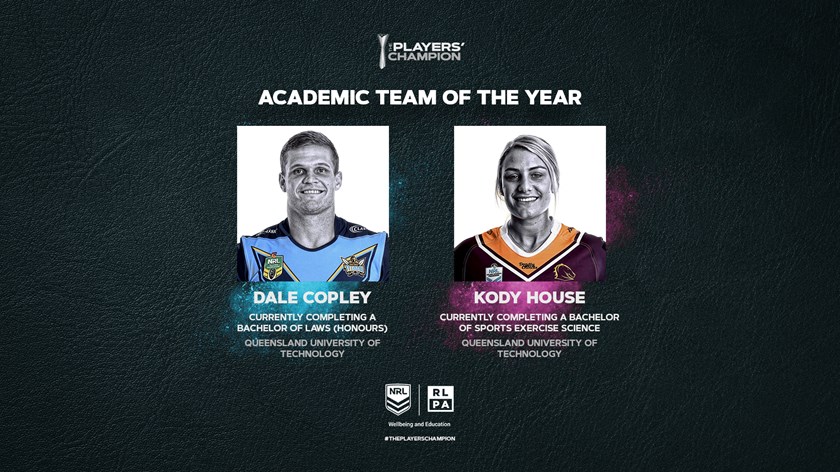 Highlighted for their academic achievements were the Bulldogs' Aiden Tolman, the Roosters' Isaac Liu, Cronulla's Jayson Bukuya, Canberra's Dunamis Lui, the Warriors' Simon Mannering, the Cowboys' Michael Morgan, the Panthers' Dylan Edwards, the Eels' David Gower, the Titans' Dale Copley, the Broncos' Korbin Sims, Melbourne's Ryley Jacks, South Sydney's Cameron Murray and Broncos women's player Kody House.