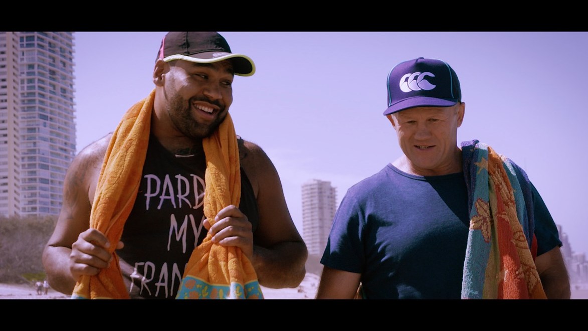 A host of current and former Queensland players came together on the Gold Coast for the shoot, which centres around a game of touch footy on the beach.