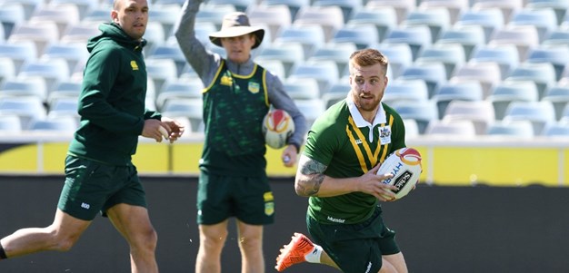 Australia Kangaroos coach Mal Meninga and captain Cameron Smith front the media following their World Cup final win over Fiji.