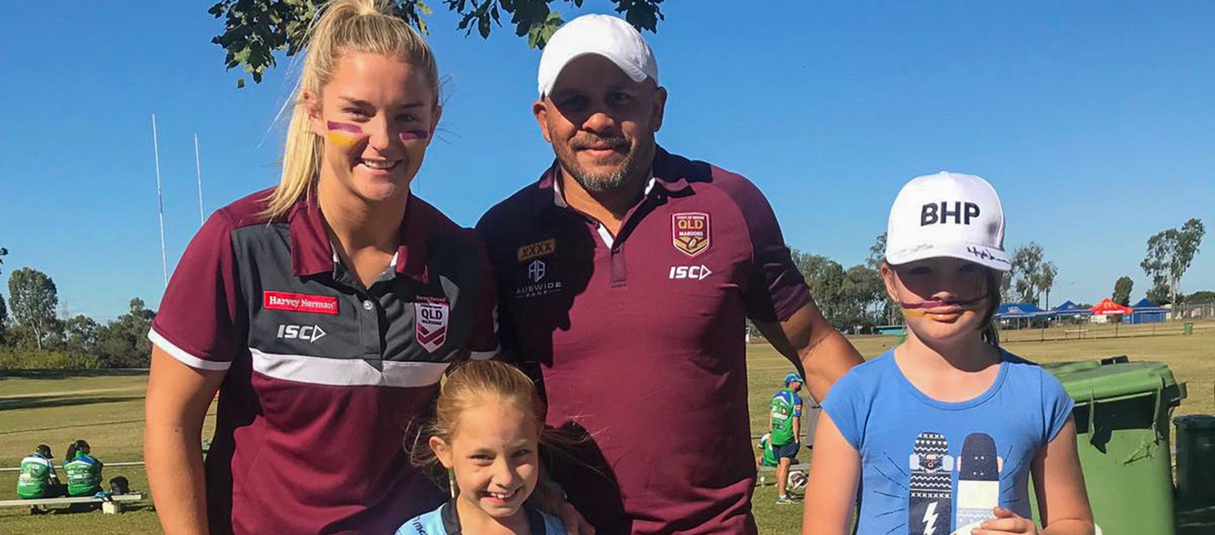 Queensland Maroons legend Matty Bowen and Harvey Norman Queensland Maroons star Meg Ward have been in Moranbah as part of the BHP Kicking Goals Community Days. More than 150 children took part in free rugby league training clinics, there has been live entertainment, and plenty of football action at Moranbah Miners.