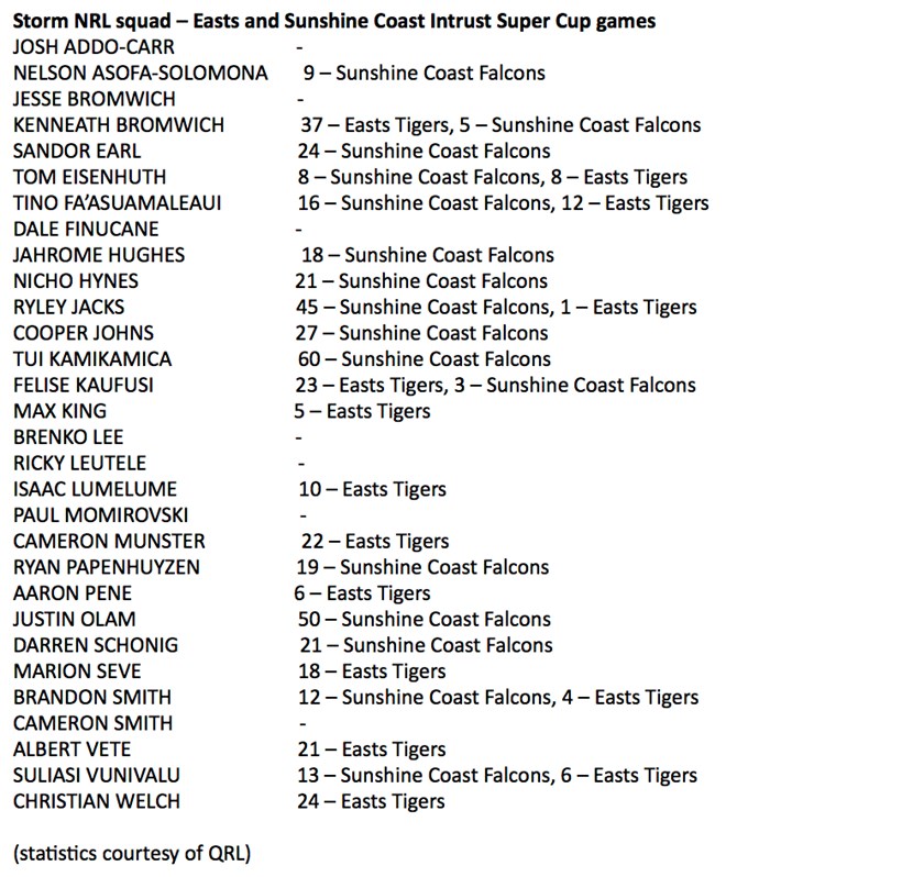 The 2020 Storm NRL squad has played a combined total of 548 matches for Easts and the Sunshine Coast.