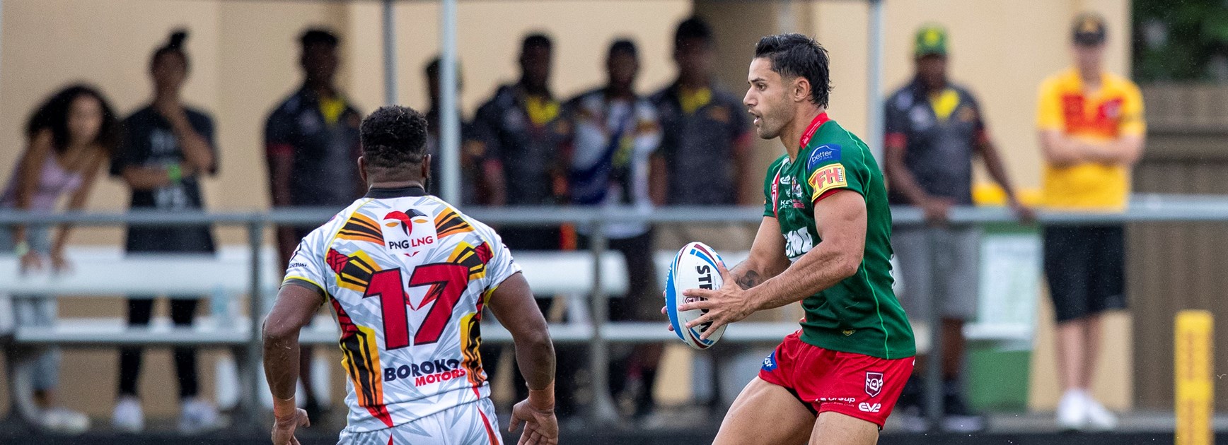 Winger for Storm is number 2 George JenningsWinger for Dragons is number 5 Mikaele Ravalawa