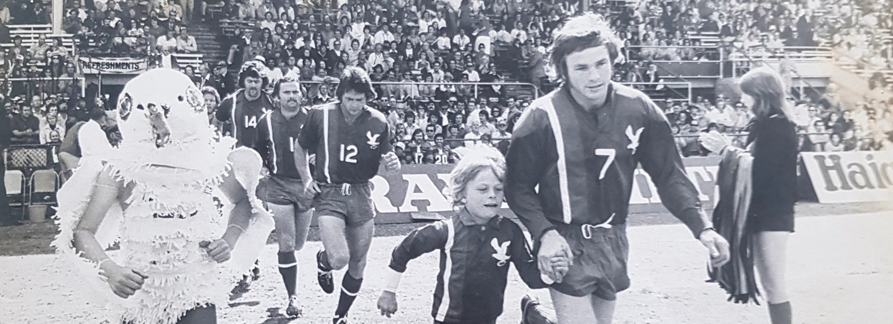 Main image: Des Lee leads Wynnum Manly on to Lang Park for the 1976 reserve grade grand final against Wests. He is holding the hand of Wynnum ball boy, Heath Lewis, brother of rugby league ‘Immortal‘ Wally Lewis. Photo: supplied